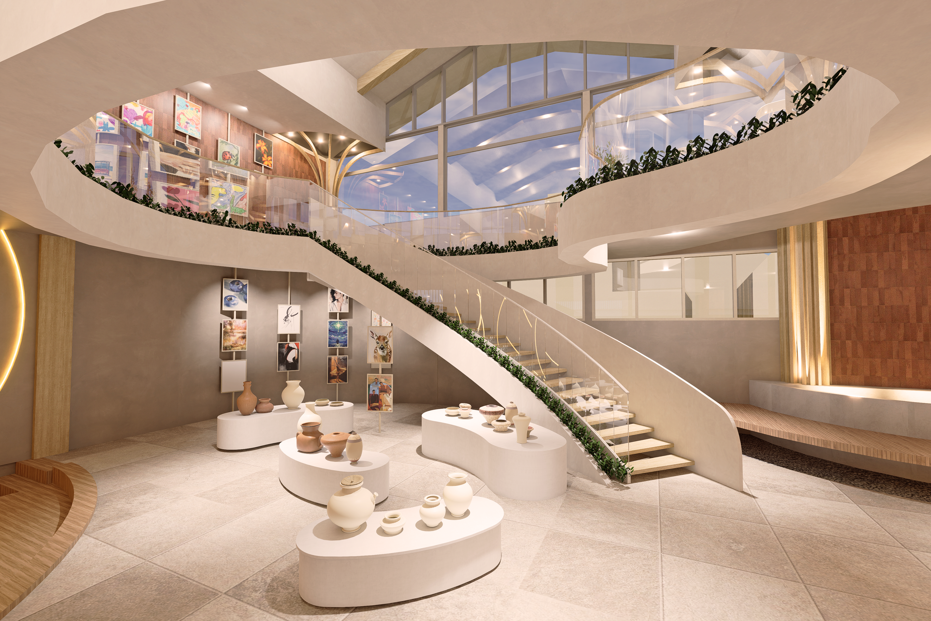 Following the keywords of 'calm', 'creativity', and 'fluidity', it's led me to the use of organic forms. It creates a calming environment making it easy for users to experience Continuum Studio at their own pace. These curved elements include my curved walls, furniture as well as the layout plan of Continuum Studio.
